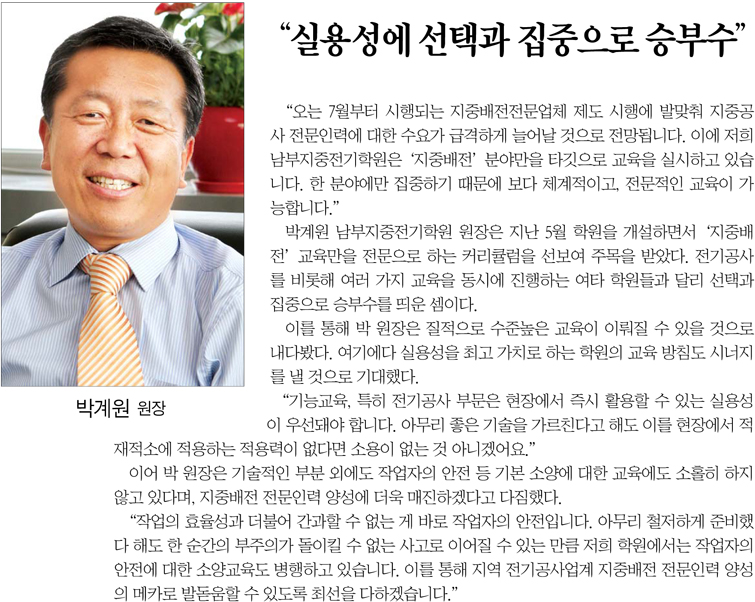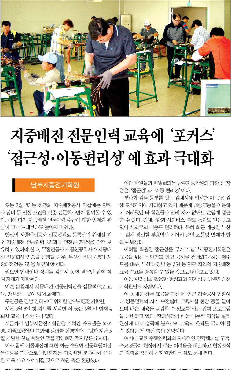 공지 전기신문에 기재된 남부지중전기학원 기사입니다.